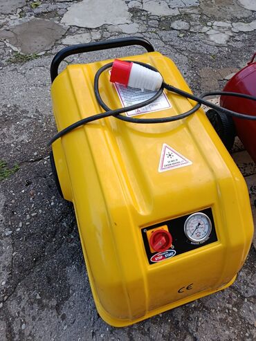 - Elektrikli yuyucu/kompressor korpusu (sarı): CE nişanlı, üzərində təcili stop düyməsi və manometr. Güclü qoruyucu korpus, elektrik kabeli ilə.