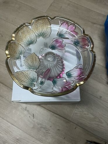 - Dizayn: qızılı haşiyəli, qabın iç səthində relyef yarpaq və çiçək (çəhrayı-yaşıl tonlarda) naxışlar