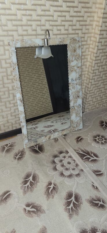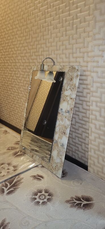 - Güzgü: qalın çərçivəli dekorativ güzgü, üst hissəsində tək lampalı işıqlandırma üçün armatur; çərçivə bej/mərmər effekti ilə