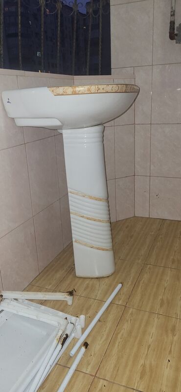 - Dizayn: sütun ayaqlı lavabo; üst hissədə və sütunda bej-qızılı naxışlı dekor xətləri; oval/ düzbucağa yaxın kasa forması, ortada qaraj sifon dəliyi və arxa tərəfdə qaraj dəliyi