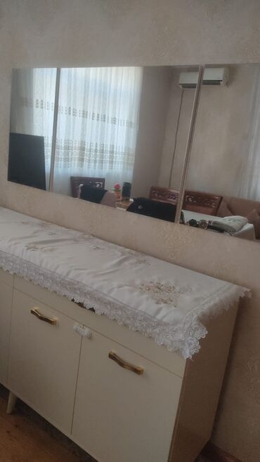 Mebel: Geniş bufet/konsol güzgü ilə - Dizayn: İki rəngli kombinasiya – krem və ağac teksturası. Üst hissə parlaq səthlidir, yüngül əyri güzgü ilə tamamlanır. - Ölçü (təxmini): uzunluq təxminən 2,0...
