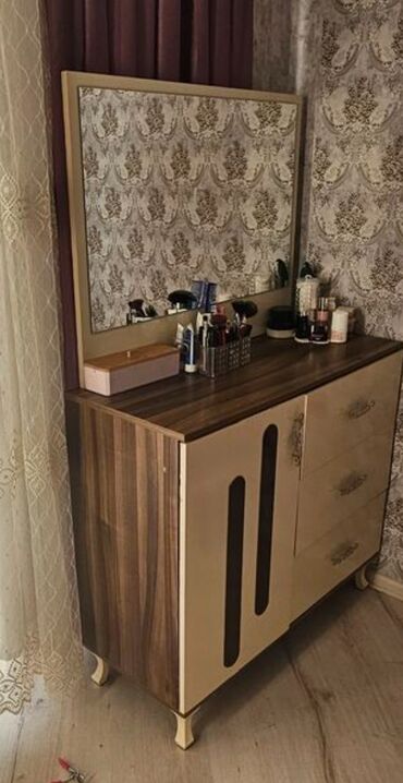 Açıq palıd rəngində böyük şkaf/komod. sol skafda biraz bosduq var.bele basga qiriqi falan yoxdur. ayna ayridi. aynanida ustunde isteses verirem. - Üst hissə: geniş düz səth – kosmetika, bəzək əşya...