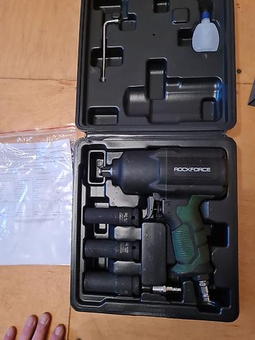 - ROCKFORCE pnevmatik vurucu açar (udarni kluç). Çamadanda yağ qabı, altıbucaqlı açar, hava qoşucu nipel və təkər boltları üçün qalın divarlı bir neçə zərbəyə davamlı başlıqla birlikdə.
