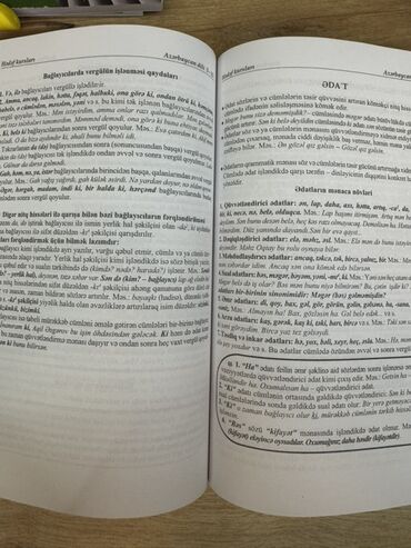 - Kitabın iç səhifələrində bağlayıcılarda vergülün işlənməsi, ədatlar və onların mənaca növləri kimi mövzular geniş izah olunur.