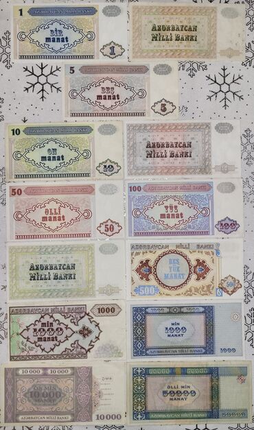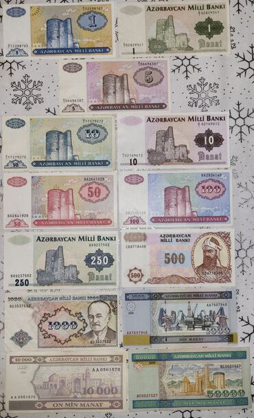 - Azərbaycan Milli Bankının köhnə emissiyalarından müxtəlif nominal və dizaynlarda banknotlar komplekti.