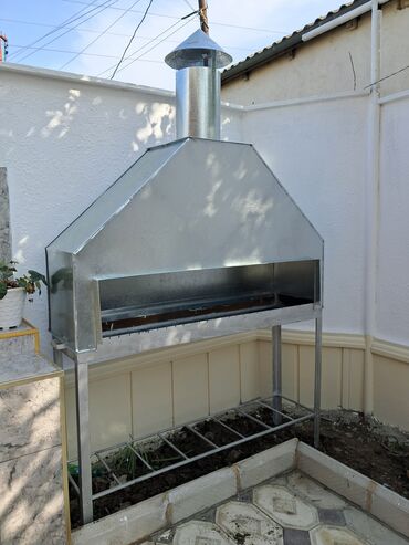 Paslanmayan poladdan peşəkar manqal–soba (şaxta ilə) Məhsul təsviri: - Restoran, dönərxana, kababçı və iaşə obyektləri üçün nəzərdə tutulmuş, tüstü borusu/çəkmə şaxtası olan iri həcmli manqal-soba...