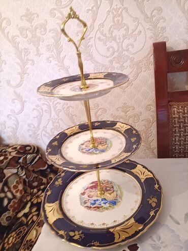Üçlü boşqab üçmərtəbəli Göy -qızılı bagema. iki növdə satılır. Bir ədədinin qiyməti 20 Azn - ə satılır endirimlə.