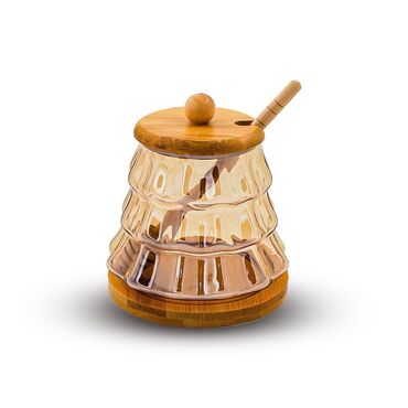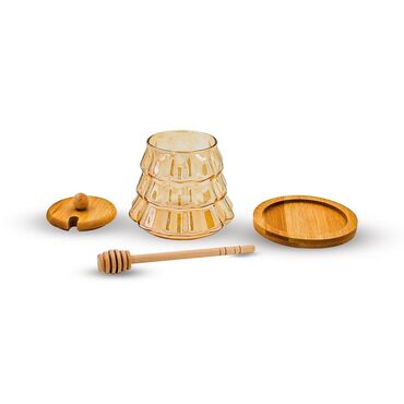 Bal qabı Şüşe material Bal rengi Bamboo altlıq ve bamboo qaşıq deste