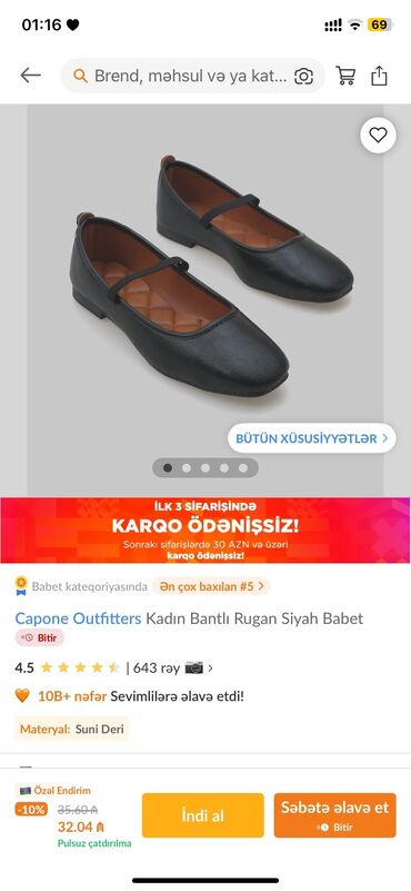 Pulsuz çatdırılmaÜnvandan götürməBalet Trendyoldan sifariş edilib. Capone mağazasından alınıb. Geyinilməyib. Rəylərdə tam qəlib yazıldığı üçün 36 ölçü sifariş etmişdim ki, altına da 36 yazılıb. Amma Ölçü böyük oldu.. 37 ölçü geyinənlərə uyğun olar.