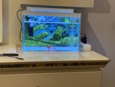 Akvaryum dəsti – dekorativ bitkilər və avadanlıqlarla - Şüşə akvaryum, ağ çərçivəli qapaq - Daxili su filtri/kompressor (şəkildə görünən) - Üst işıqlandırma sistemi - Dib üçün dekor: mavi və yaşıl...
