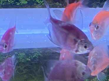 - Akvaryumda bir neçə rəngli tropik akvarium balığı var: çəhrayı-qırmızı tonlarda, qrup halında üzür və işıq altında parlaq görünür.