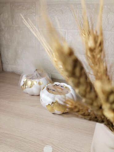 - Material: soy mumu əsaslı ətirli şam, ağ rəngli balqabaq formalı dekor qab.