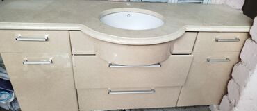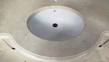 - Material: Bej rəngli mərmər üst səth, dairəvi ağ qab lavabosu