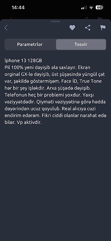 Iphone 13 sade 128 yaddas 6 ram pil 86.Qutu senet zaryatqa her seyi var.temirde olmayib. Qiymet 700 azn. Unvan Yasamal Vesile🌹4713