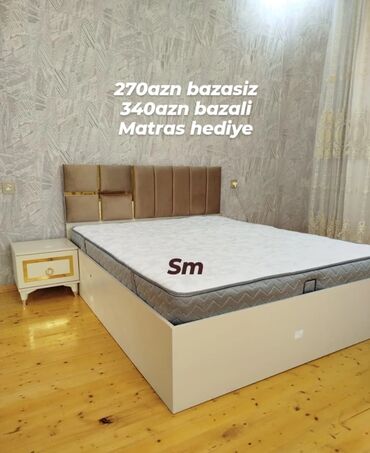 Mebel dəsti – yumşaq başlıqlı çarpayı (bazalı və ya bazasız), hədiyyə matrasla - Model: Müasir minimal dizayn, yumşaq parça ilə işlənmiş panel başlıq, qızılı dekor xəttləri - Rənglər: Bej, krem, a...