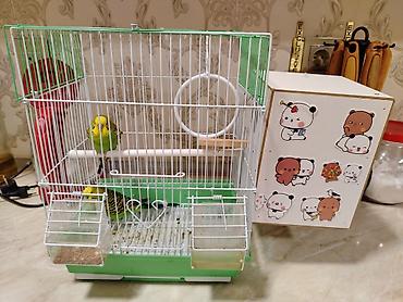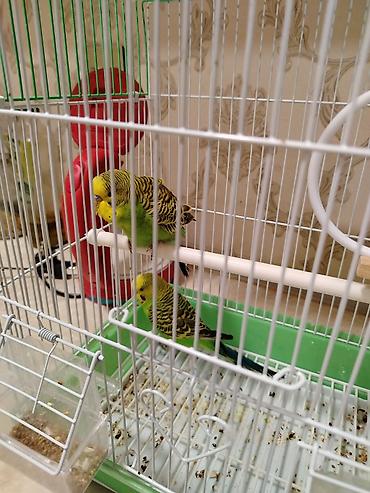 Dalğalı tutuquşular və qəfəs dəsti gəfəslə bir yerdə. ələ öyrəncəlidirlər ikisidə. - 2 ədəd dalğalı tutuquşu: biri mavi-ağ, digəri yaşıl-sarı rəngdə - Metallik ağ rəngli, üst hissəsi tağlı geniş qə...