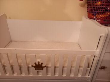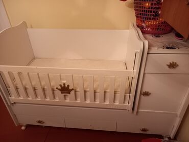 İdeal olaraq həm yatmaq, həm də geyim və aksessuarların səliqəli saxlanması üçün çoxfunksiyalı beşik-komod dəsti.