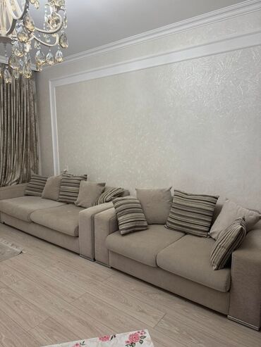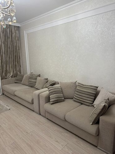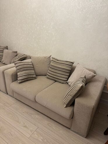 - Yastıqlar: Hər divanla birlikdə bir neçə ədəd dekorativ yastıq. Zolaqlı və düz bej kombinasiyası interyerə uyğunlaşdırma üçün əlverişlidir; yastıq üzlükləri çıxarıla bilən tipdədir (şəkillərdə fermuar tikişləri görünür).