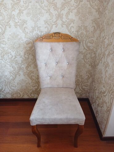 - Kreslo/Stul: yumşaq bej parça ilə üzlənmiş, arxa hissəsində düyməli kapitone bəzəkləri. Arxa üst kənarda ağacdan ornamentli dekor detalı. Qabarıq S formalı taxta ayaqlar klassik görünüş verir.