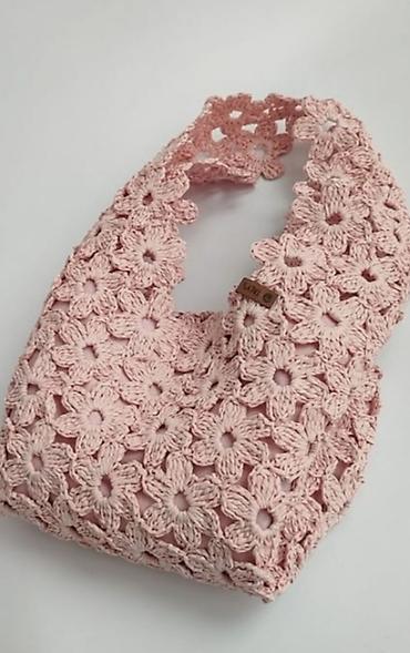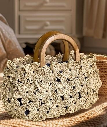 Makrame toxuması ilə hazırlanmış, açıq bej rəngli əl çantası. Çantanın yuxarı hissəsində taxta tutacaqlar mövcuddur. Çanta gündəlik istifadə üçün uyğundur.