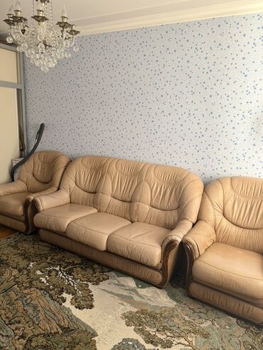 Həqiqi dəri. Əsl dəri divan. Bej divan + 2 kreslo.