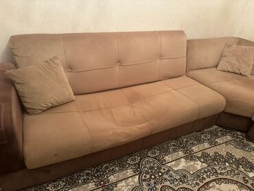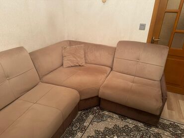 - Material: Xoş toxunuşlu məxmər/velur tipli parça üzlük, rəng palitrası – isti bej/karamel tonları. Eyni parçadan 2 dekorativ yastıq daxildir.