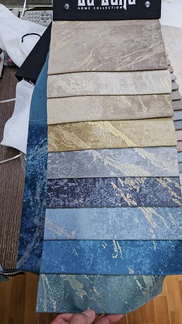 Lüks dekorativ parça kolleksiyası – Home Collection - Məhsul: Qalın, yumşaq teksturlu dekor/parça nümunələri - Dizayn: Qızılı metalik naxışlı, mərmər effektli və zərif parıltı verən səth - Rəng pa...