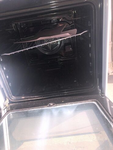 - Elektriklə işləyən soba: konvektor ventilyatoru görünür, şüşə qapı, tel şəbəkə rəfi və tepsi