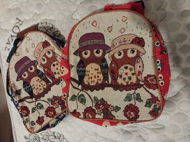 Üzərində cüt bayquş təsviri olan, toxunma parçadan hazırlanmış, qırmızı rəngli bel çantası. Bayquşlar şlyapalıdır və güllərlə bəzədilib. Uşaqlar və gənclər üçün idealdır.