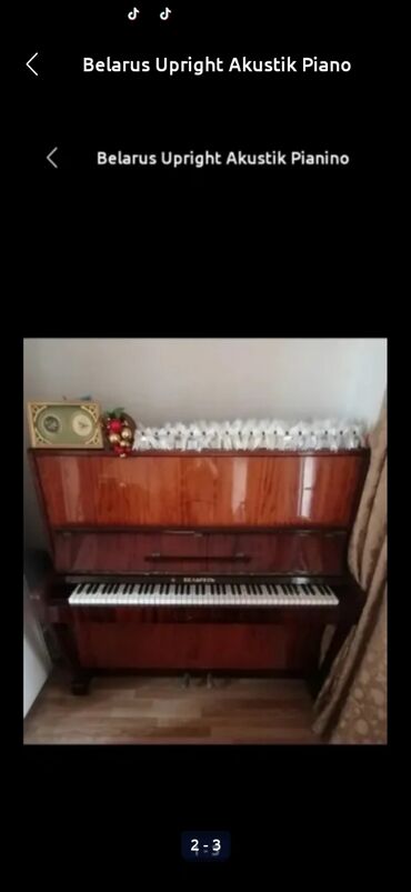 Qeyd: Şəkillərdə gördüyünüz pianino Belarus istehsalı şaquli akustik modeldir; üst hissəsində dekorativ yerləşdirmə üçün geniş səth mövcuddur.