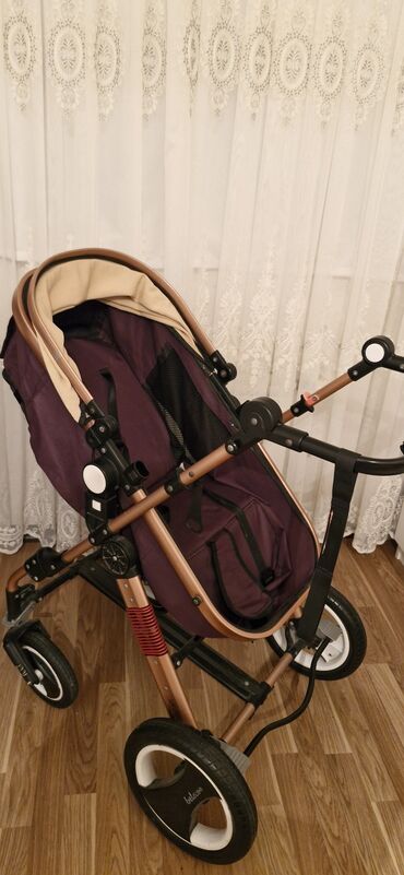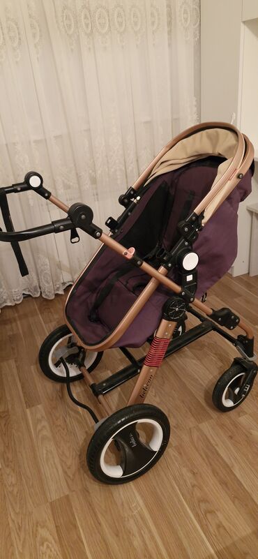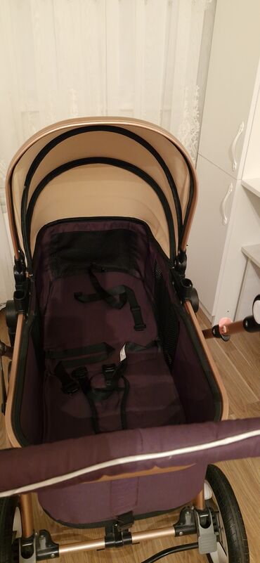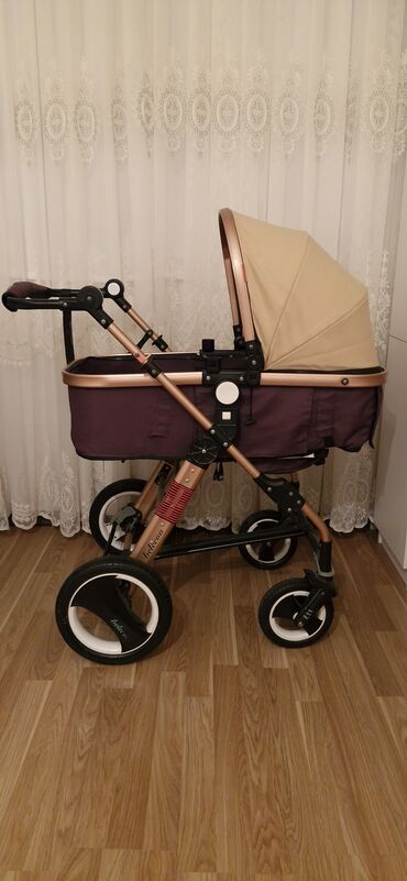 Uşaq arabası – bənövşəyi rəng, 2-in-1 tipli (körpə beşiyi kimi dərin oturacaq və gəzinti rejimi). Xüsusiyyətlər: - Təkər düzümü: ön tərəfdə ikiqat fırlanan təkərlər, arxada iri təkərlər; amortiza...