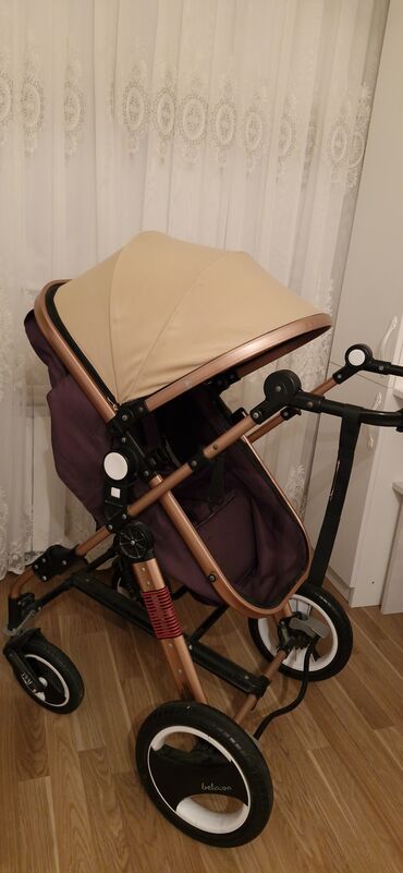 Uşaq arabası – Belecoo markası - Tip: 2-in-1 klassik araba (beşik tipli oturacaq modulu) - Rəng: bej/qızılı çərçivə, qara detal və təkərlər - Təkərlər: iri rezin təkərlər, ön təkərlər fırlanan, ar...