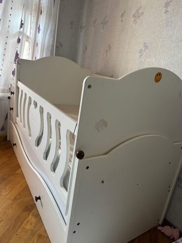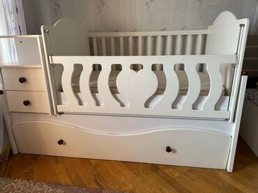 Çoxfunksiyalı dizayn: beşiyin yanında olan çekmecəli modul sayəsində paltar, bez və xırda əşyalar əl altında saxlanılır; alt çekmece geniş saxlama imkanı verir. Sürüşkən bort valideynə körpəni rahat götürüb-qoymağa şərait yaradır. Ağ rəngli neytral görünüş müxtəlif uşaq otağı interyerlərinə uyğun gəlir.