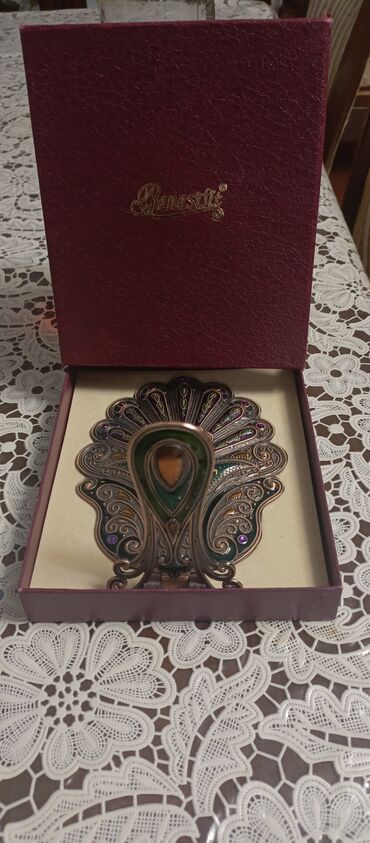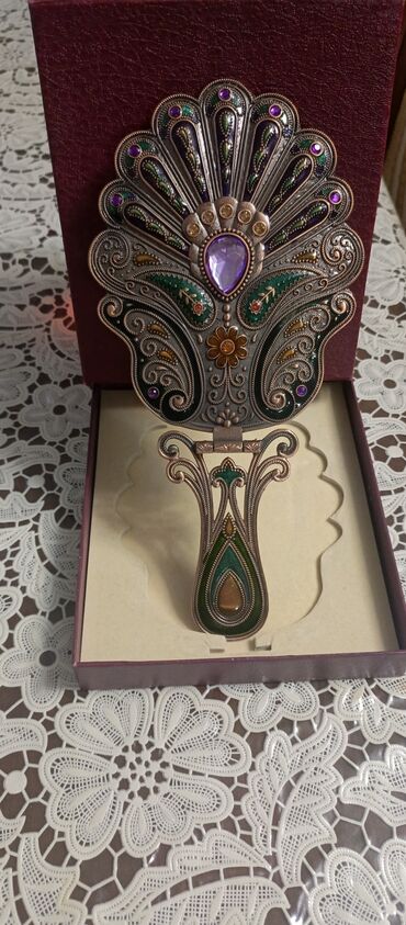 Benesitt əl güzgüsü - Dekorativ naxışlı, pauk-quşu (. tovus) motivli dizayn. - Oval güzgü səthi, ətrafı relyef işləmələr və rəngli daş bəzəklərlə - Metal-korpus görünüşü, uzun saplı, asa...