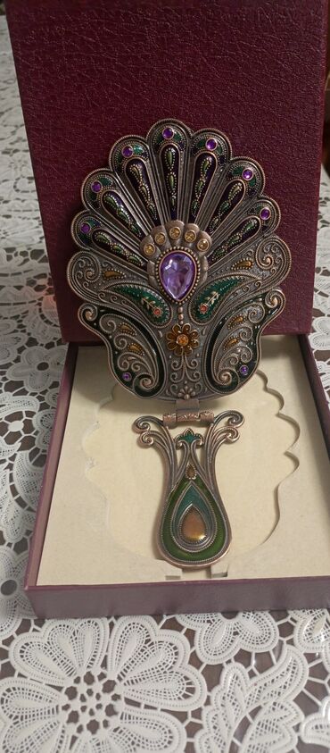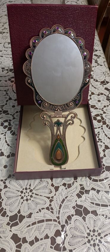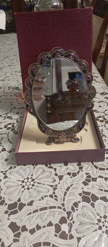Suvenir Güzgü.Ev malıdır.Çox gözel formadadır Bəzəklidir.Stolustu qoymaq olar Fiqurni ayağı var Möhkəm materiyaldandir.Qədimi maldir.