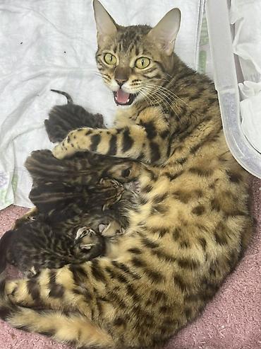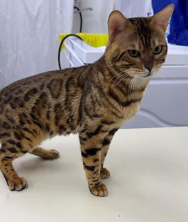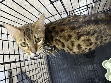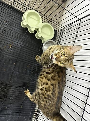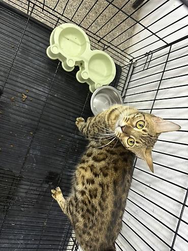 Şəkillərdə metal qəfəs, ikiqat yem qabı və su qabı görünür. Pişik sağlam görünüşlü, kompakt və əzələli quruluşa malikdir, typik Bengal naxışları aydın seçilir.