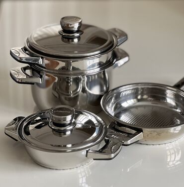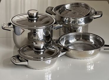 Aura qazan dəsti. 7 parçadan ibarətdir. 3 qazan 3 qapaq və süzgəc(və ya parovarka). Yenidir, istifadə olunmayıb. Böyük qazanın bor qulpu əyri və qırağında qırığı olduğu ücün endirim olunacaq