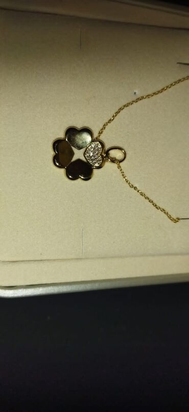 - Dizayn: dördyarpaq yoncaya bənzər, dörd ürək formalı element; onlardan biri mikrodaşlarla (parlaq sirkon/qaş) bəzədilib