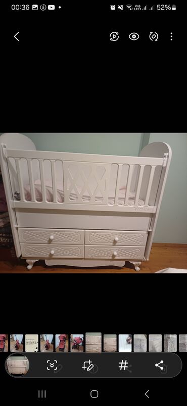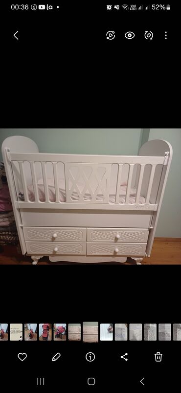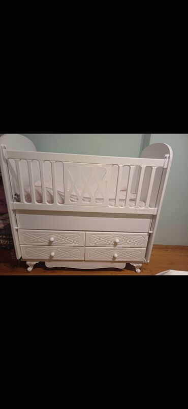 Mehra….Məhsul: Beşik (matraslı) - Brend/üzərində yazı: belis - Rəng: açıq çəhrayı və ağ - Material: laminat/MDF tipli taxta konstruksiya - Yan tərəf sürüşdürülərək aşağı-yuxarı hərəkət edən məhəcc...