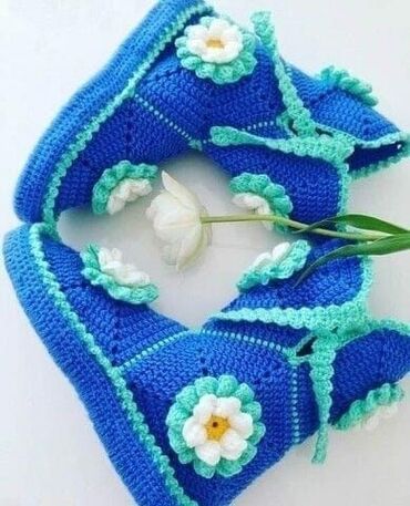 Əl işı toxunma ev tapığı (xalatka) – rəngli naxışlı model - Material: akril saplardan toxunma - Rənglər: sarı, mavi və qara kontrast kombinasiya - Dizayn: meydança formasında qoşa “granny square” m...