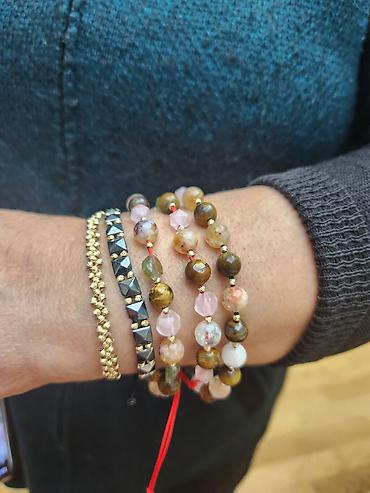 - Model 3: Təbii daş qarışığından (şabalıdı-yaşıl “pələng gözü” effektli, şəffaf-açıq bej tonlarda və digər yarımşəffaf daşlar) 8 mm yuvarlaq muncuqlarla yığılmış elastik bilərzik. Hər muncuğun arasında xırda qızılı ara-furnitur işlənib.