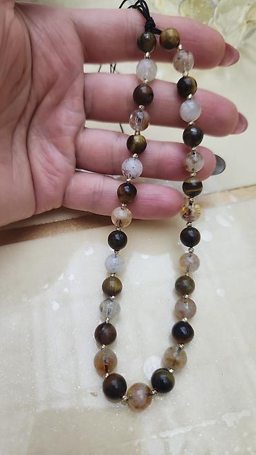 - Materiallar: təbii daş muncuqlar, qızılı rəngli ara-detal və furnitur, yüksək keyfiyyətli elastik/sürüşdürmə ipi