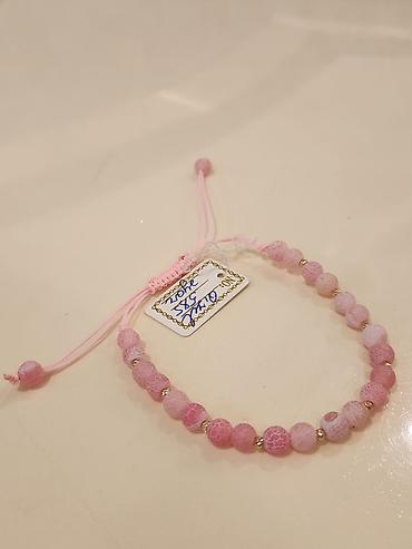 - Model 1: Açıq-çəhrayı tonlarda mat effektli şar daşlardan hazırlanmış, aralıqda kiçik qızılı rəngli ara-furniturla bəzədilmiş iplə bağlanan, ölçüsü sürüşdürmə düyünü ilə tənzimlənən bilərzik. Yumşaq çəhrayı ip uclarında dekorativ muncuqlar var.