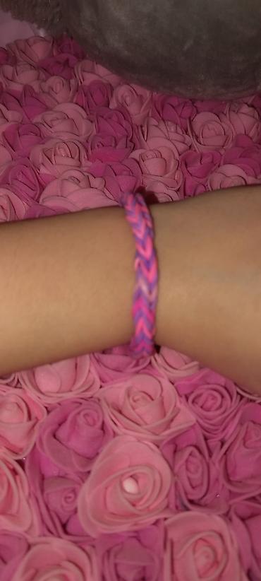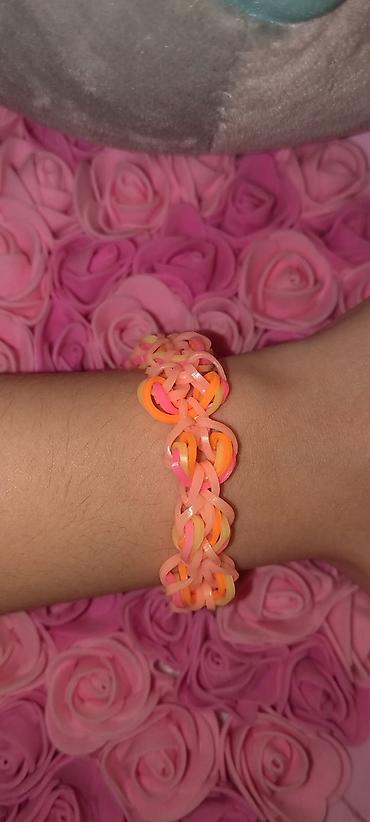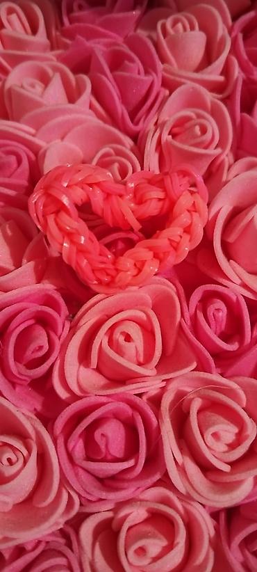 - Çəhrayı rəngdə rezin bantlardan toxunmuş ürək formalı bəzək