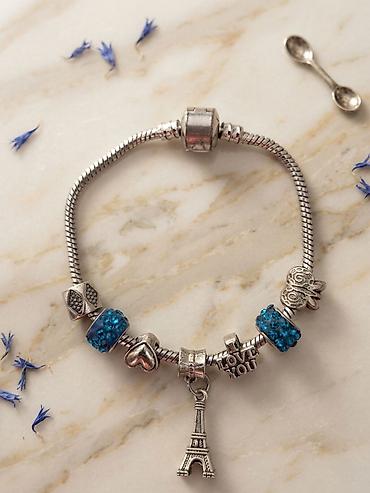 Pandora üslubunda charm qolbaq - Material: gümüş rəngli metal zəncir (ilıq elastik olmayan zəncir tipli), klipsli kvadrat kilid. - Ölçü: standart dairəvi qolbaq, sərt zəncir forması. - Charm-lar: ...