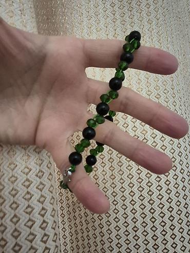 - Dizayn: Tünd yaşıl, kəsimli kristal tipli muncuqlar və parlaq qara dairəvi muncuqlar növbəli şəkildə düzülüb.