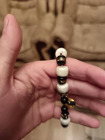 Qara muncuqlu elastik bilərzik - Material: parlaq qara muncuqlar (sintetik daş/akril tipli), elastik iplik - Dizayn: dairəvi muncuqlar, aşağı hissədə sallanan dekorativ uc; uc hissədə qızılı rəngl...