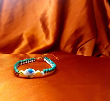 Yaşıllı və ağ muncuqlarla bəzədilmiş, mərkəzində mavi detallı bir muncuq olan əl işi bilərzik. Bilərzikdə həmçinin sarı rəngdə smailik muncuqlar da var. İplə bağlanır, buna görə də müxtəlif ölçülərə uyğundur.