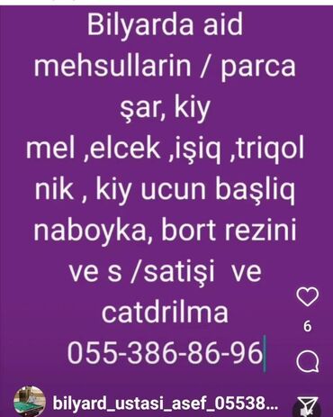 bilyard .Amerkan pul bilyard stolu satilir Tam prafisional qara mermer 9 fut. Cox kefiyetli matrialdan yigilib.butun detallarina xususi nezaret edilib. Ustunde her sey verilir. Parcasi. Şarlari tam...