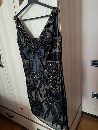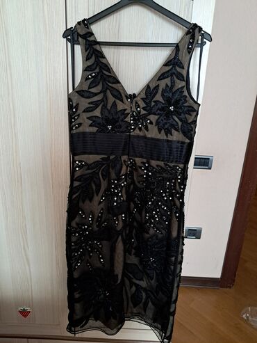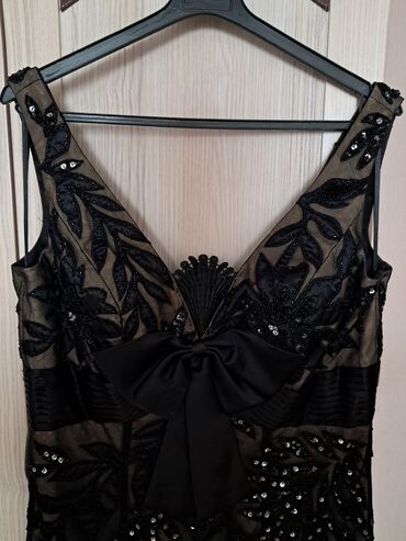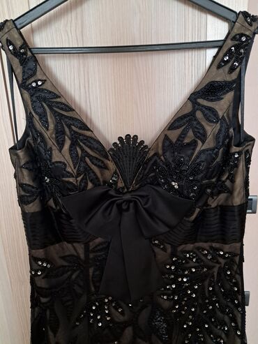 Qara rəngli uzun ziyafət/libas – xüsusi dizayn M və L ölçü - Bədənə oturan, qolsuz siluet - Ön hissədə qızılı rəngli zəngin naxış və payet işləri - Parlaq efekt verən payetli parça - Dairəvi yaxa ...